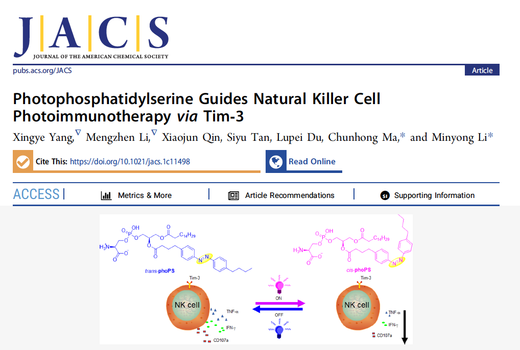 近日,米乐李敏勇教授团队与山东大学基础医学院马春红教授团队合作在Journal of the American Chemical Society(中科院JCR一区,IF=15.419)上发表了“Photophosphatidylserine guides natural killer cells photoimmunotherapyviaTim-3”为题的合作研究成果。米乐·M6(China)官方网站博士研究生杨兴业和基础医学院博士研究生李梦真为共同第一作者,米乐·M6(China)官方网站李敏勇教授和基础医学院马春红教授为共同通讯作者,山东大学为第一作者单位和唯一通讯作者单位。