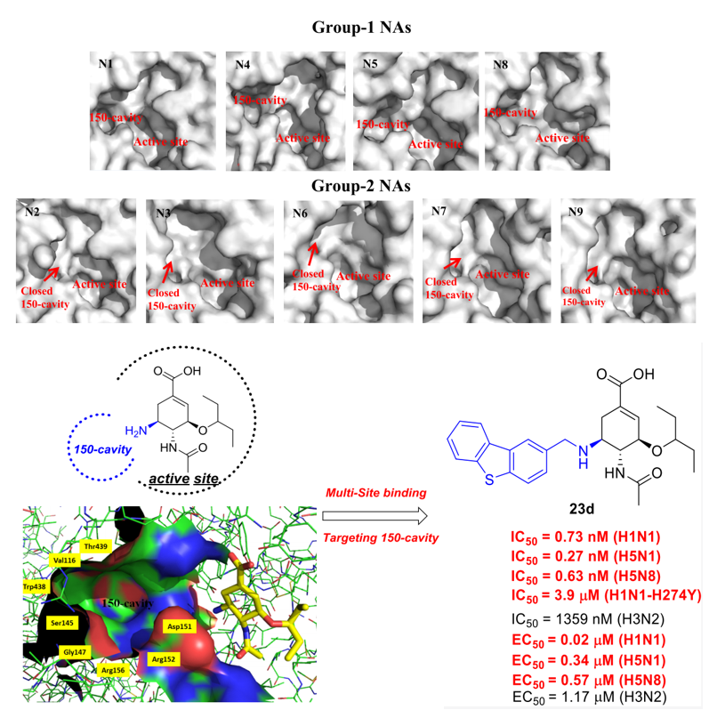 神经氨酸酶抑制剂(NAI)是目前防治流感的一线药物,其中唯一可以口服的奥司他韦更是临床治疗的首选药物。然而流感病毒固有的高变异性致使对奥司他韦高度耐药的毒株(如N1-H274Y和N2-E119V)在世界范围内频现,严重削弱了该药物的防治作用。因此,研发新型、高效和抗耐药的NAI一直是抗流感药物研发领域的热点。