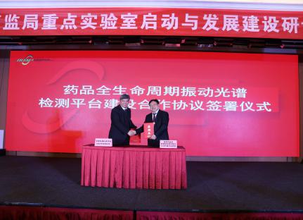 重点实验室启动仪式上,国家药监局药物制剂技术研究与评价重点实验室主任臧恒昌研究员、中国仪器仪表学会近红外光谱分会副理事长邵学广教授作为双方代表签署了药品全生命周期振动光谱检测平台建设合作协议。