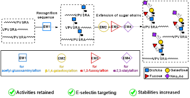 本研究建立了一种非常有效的酶法模块化组装策略,实现了多肽的sLex(Siaα2–3Galβ1–4(Fucα1–3)GlcNAcβ1–R)糖基化修饰,合成糖肽的量达到了制备或半制备的规模。该糖基化修饰策略是,在多肽的N端、C端或两个活性多肽的中间,连接上O-糖基转移酶ncOGT能够识别的最短多肽序列VPVSRA,通过多步酶模块化反应连接上sLex。第一个单糖GlcNAc在酶模块化1(EM1)的催化作用下,通过O-糖苷键连接到多肽VPVSRA的Ser上;其它的三个糖分别在酶模块化2、酶模块化3和酶模块化4(EM2−EM4)的作用下,依次连接延长形成sLex四糖。