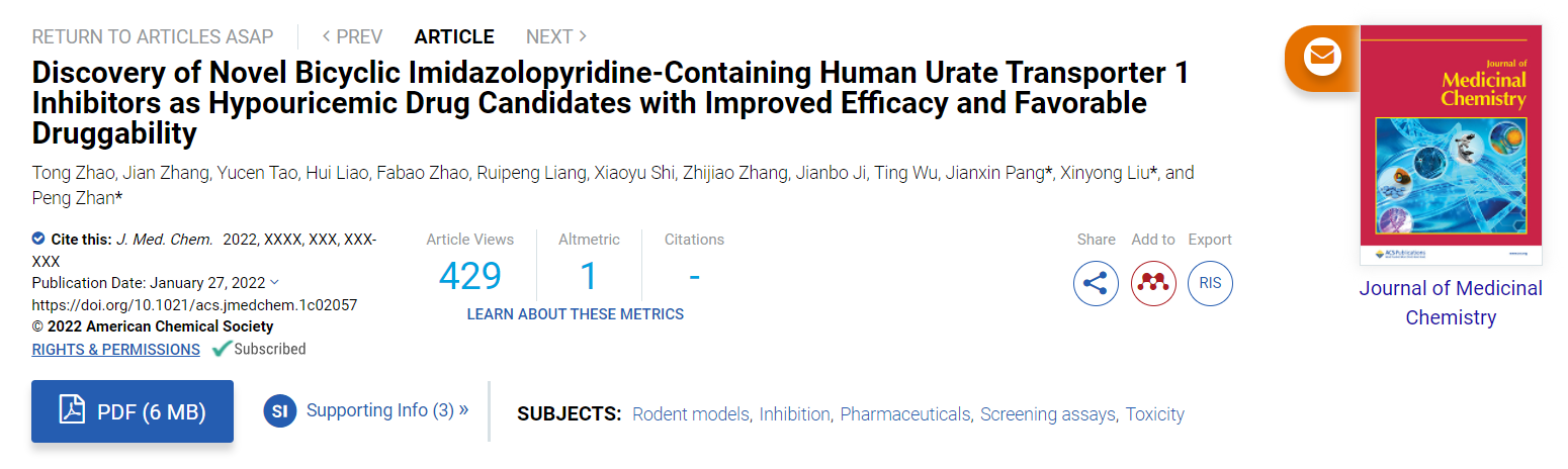 本研究以“Discovery of Novel Bicyclic Imidazolopyridine-Containing Human Urate Transporter 1 Inhibitors as Hypouricemic Drug Candidates with Improved Efficacy and Favorable Druggability”为题发表在药物化学领域国际顶级期刊Journal of Medicinal Chemistry。米乐在读博士生赵彤和硕士生章健为本论文的共同第一作者,展鹏教授、刘新泳教授、南方医科大学庞建新教授为本论文的共同通讯作者。山东大学为第一通讯单位。