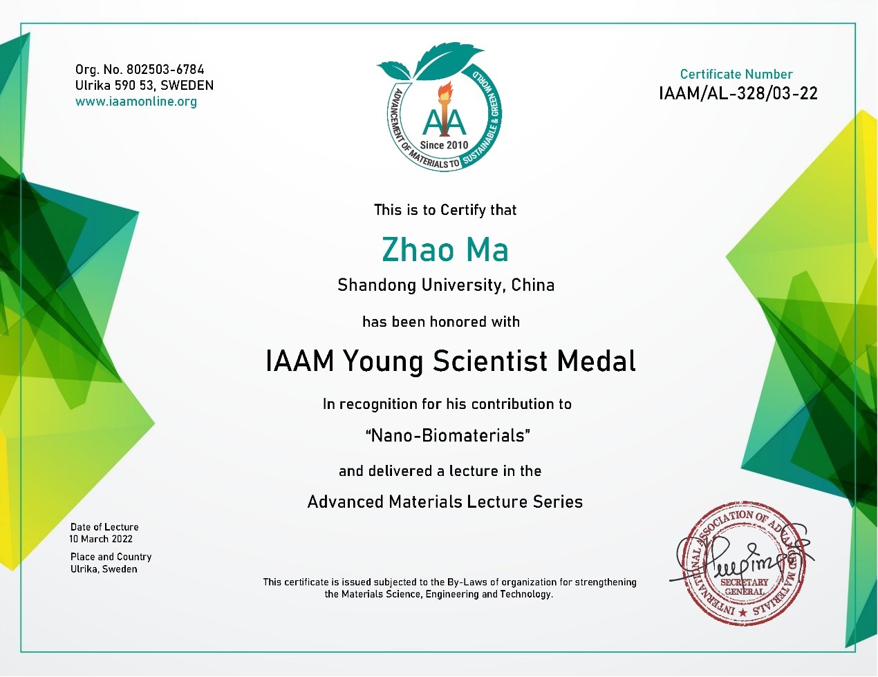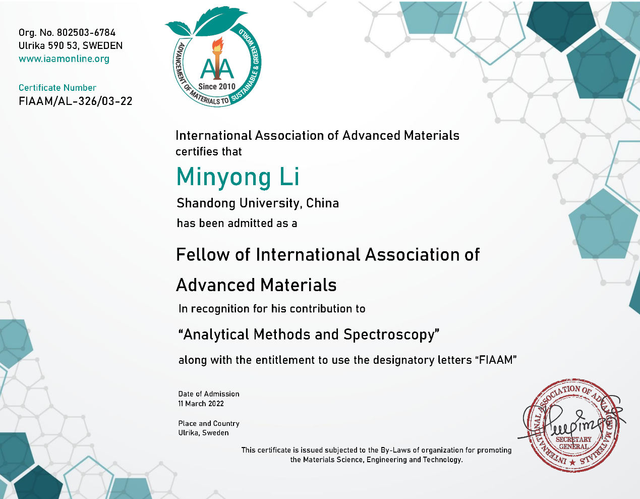 国际先进材料学会总部设在瑞典,是致力于为先进材料科学、工程和技术在世界范围内的快速发展提供平台的国际性学术组织,目前拥有来自超过125个国家的50000多名会员。会士根据研究人员近十年在先进材料基础和前沿应用领域所做的工作在世界范围内进行评选,授予在先进材料科学与技术领域做出重要贡献的研究人员,为该组织颁发给研究人员的最高学术荣誉称号;青年科学家奖授予在材料科学、工程和技术方面进行高质量研究或表现出优点和潜力的年轻新兴科学家。