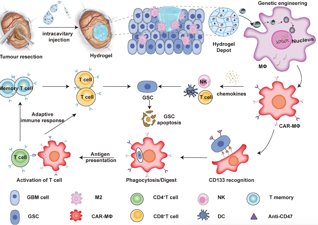 术后瘤腔周围“局部”MΦ原位CAR结构编辑及其靶向清除GSCs研究思路