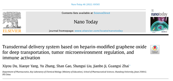 近日,米乐·M6(China)官方网站翟光喜教授团队在国际期刊Nano Today杂志上发表了题为“Transdermal delivery system based on heparin-modified graphene oxide for deep transportation, tumor microenvironment regulation, and immune activation”的研究性论文(中科院JCR一区),翟光喜教授为通讯作者,博士研究生杜希友为第一作者,山东大学为独立通讯作者单位。