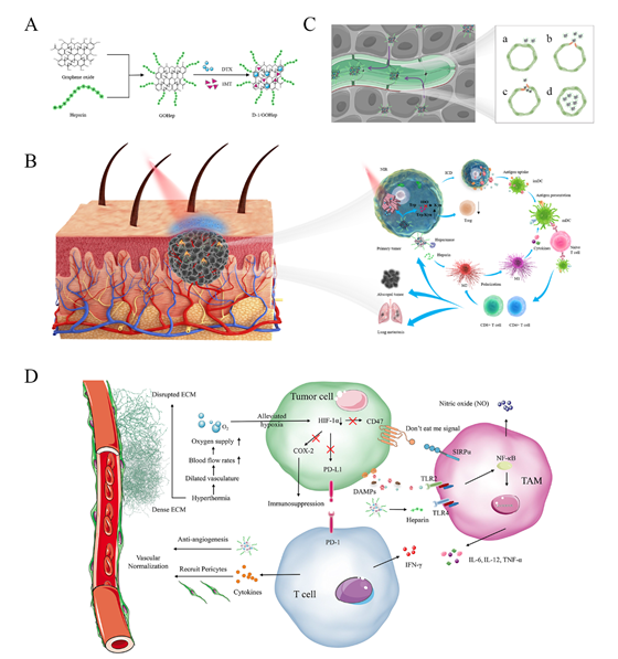 在透皮给药黑色素瘤的治疗中,增强皮肤渗透和促进肿瘤浸润是一个棘手的挑战。在本研究中,开发了一种多功能纳米平台D-1/GH,使用肝素(Hep)修饰的氧化石墨烯纳米片负载多西紫杉醇(DTX)和1-甲基-D-色氨酸(1MT)。利用Hep介导的角质层(SC)水合作用,D-1/GH通过细胞间途径和附属器途径渗透皮肤。基于肿瘤相对渗漏的结构和Hep对肿瘤的高亲和力,D-1/GH可以浸润至肿瘤组织。随后,D-1/GH通过血管和淋巴管被运送到更深部的肿瘤。该研究首次报道了D-1/GH的透皮-肿瘤深部转运机制,即D-1/GH通过淋巴管内皮受体-1(LYVE-1)介导的淋巴迁移杯结构包裹进入淋巴管中,通过增强渗透和滞留(EPR)效应进入血管,递送至远离皮肤一侧的深部肿瘤组织。D-1/GH介导的联合疗法改善了化疗和光热疗法(PTT)的治疗效果,增强了1MT对IDO通路的抑制作用,同时诱导免疫原性细胞死亡(ICD),募集免疫细胞并引发免疫反应。D-1/GH逆转免疫抑制性肿瘤微环境以增强免疫反应,从而抑制远端肿瘤和肺转移。该研究通过提高纳米药物经皮渗透和肿瘤深度转运,为提高抗肿瘤功效、增强免疫反应和避免细胞毒药物的全身分布提供了新的视角。