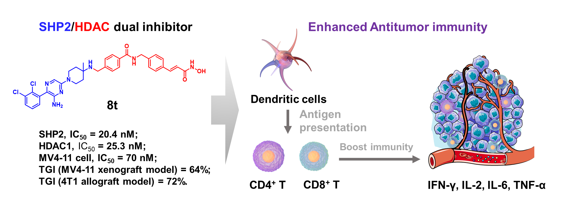 由PTPN11基因编码的SHP2蛋白(含有Src同源2结构域的蛋白酪氨酸磷酸酶2)在诸多与肿瘤相关的信号通路(RAS-RAF-ERK、PI3K-AKT、JAK-STAT和NF-κB)中发挥重要作用。近年来研究表明,SHP2在调节肿瘤微环境中的免疫细胞功能方面发挥着重要作用,已成为重要的肿瘤免疫靶点。研究团队运用药效团融合策略,开发了首个SHP2/HDAC双靶点抑制剂8t。与SHP2抑制剂和HDAC抑制剂相比,8t对多种肿瘤细胞系表现出更强的抗增殖活性。在MV4-11异种移植模型和4T1乳腺癌模型中,8t具有比单药或联合用药更高的抗肿瘤活性,进一步证实了SHP2/HDAC双重靶向抑制剂的优势。特别值得注意的是,研究团队发现化合物8t可活化T细胞、提高抗原递呈细胞功能、促进细胞因子分泌,激活肿瘤免疫。因此,以8t为代表的SHP2/HDAC双靶点抑制剂为小分子肿瘤免疫治疗研究提供了新型先导化合物。