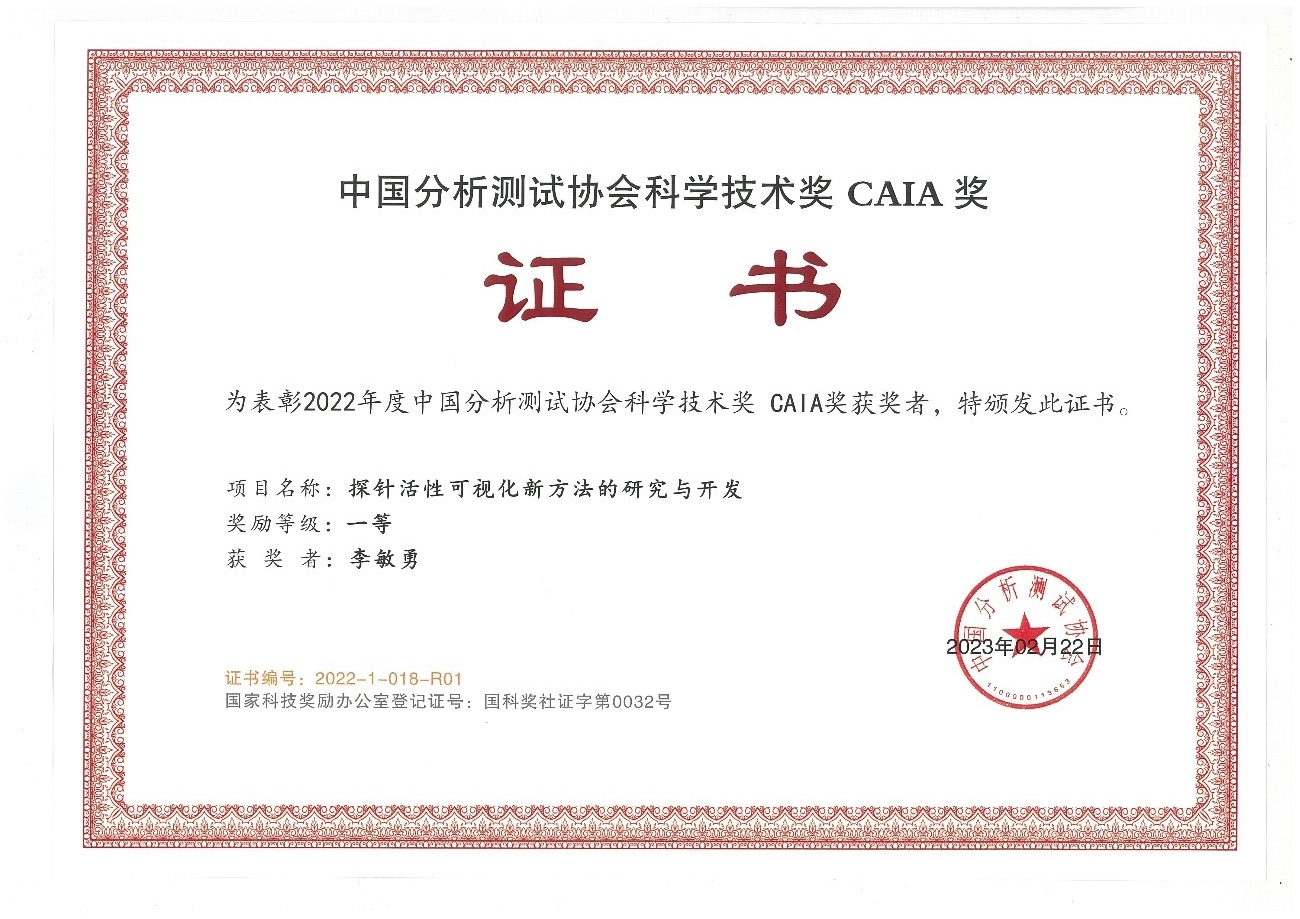 近日,2022年中国分析测试协会科学技术奖(CAIA奖)的评审结果揭晓,李敏勇教授团队完成的“探针活性可视化新方法的研究与开发”研究获评一等奖。山东大学是该成果的唯一完成单位,米乐·M6(China)官方网站李敏勇教授、杜吕佩副教授、马朝研究员分列第一、二、三位完成人。该研究成果聚焦于荧光、生物发光和化学发光技术的创新,通过设计、合成特异且灵敏的分子探针,对生物大分子和活性小分子的含量、分布和功能进行非侵袭性精准可视化分析,取得良好的社会和经济效益,为现代药物研发提供了新思路、新方法。