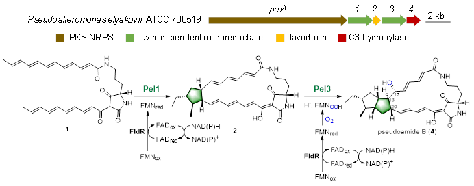 针对上述问题,该研究以从交替假单胞菌(Pseudoalteromonas elyakovii) ATCC 700519中定向发现的新5-5双环PoTeM类化合物pseudoamides为研究对象。通过体内基因缺失、体外生化和同位素标记实验,阐明了pseudoamides中5-5双环合成机制。研究显示,黄素依赖性氧化还原酶Pel1和Pel3负责5-5双环合成,且其催化功能依赖还原伴侣进行电子传递。其中,Pel1通过还原性[2+3]环加成反应合成外侧5元环,引入的两个氢分别来自FMNH2和H2O;Pel3通过FMN-C4a-hydroxyperoxide实现C13-C20环化与C12羟基化偶联反应,合成内侧5元环,C12羟基氧来源于O2。上述研究为PoTeMs多环体系合成机制的深入解析和全新环系改造奠定了基础。