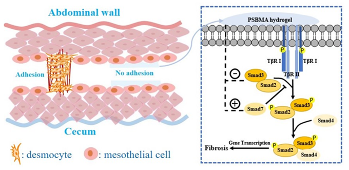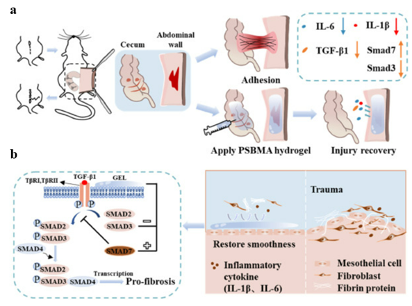 能在不规则表面形成物理屏障又能生物降解的水凝胶,可有效预防腹腔手术后粘连。翟光喜/叶磊团队结合右旋糖酐和两性离子聚合物优异的抗蛋白粘附性能,通过ATRP方法制备了两性离子接枝聚合物(Dex-g-SBMA),该聚合物可自组装形成可生物降解的水凝胶,可在病灶部位覆盖伤口。体外细胞实验表明该水凝胶具有良好的生物可降解性和生物相容性,可对TGF-β/Smad信号通路产生影响,可抑制Smad3并激活Smad7通路,从而降低组织纤维化概率,减少纤维蛋白沉积,抵抗成纤维细胞的粘附。在体内大鼠腹壁-盲肠损伤粘连模型中,水凝胶表现出良好的抗粘连能力,能够有效的抑制术后腹壁-盲肠的粘连。该研究发表于Materials & Design(中科院一区,TOP期刊),论文第一作者是米乐·M6(China)官方网站硕士研究生黄苏苏和方跃霖,叶磊副研究员、翟光喜教授和济南大学张亚彬副教授为共同通讯作者,米乐为第一作者和通讯作者单位。