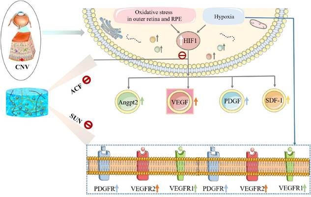 脉络膜新生血管(CNV)作为一种常见的多因素眼底病变,已成为老年人严重视力丧失的主要原因。主要治疗方法是玻璃体内侵入性注射抗VEGF药物,但频繁眼内注射抗VEGF药物对CNV患者有严重的视力影响。除VEGF是CNV形成的一种危险因素外,缺氧在CNV的进展中起着核心作用。缺氧诱导因子-1 (HIF-1)对VEGF有明显的诱导作用,是新生血管性眼病的主要分子途径。因此,将抗VEGF药物与靶向HIF-1药物联合使用是一种有价值的协同策略,可改善CNV患者的视力效果。翟光喜/叶磊团队利用低附着性透明质酸(HA)和两性离子材料,采用点击化学法制备了包载疏水药物(SUN)和亲水性药物(ACF)脂质体(Lip)的多功能原位注射水凝胶(HAC)。实验证明该水凝胶制剂可显著延长药物的治疗作用,显示了良好的抗血管生成作用,能有效改善CNV病变,是一种微创治疗新生血管性眼病的新方法。该研究发表于Materials Today Nano(中科院一区,TOP期刊),论文第一作者是米乐·M6(China)官方网站博士后李靳,翟光喜教授和叶磊副研究员为共同通讯作者,米乐为第一作者和通讯作者单位。
