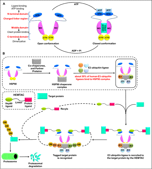 李敏勇教授团队基于热休克蛋白90(HSP90)能够结合E3泛素连接酶形成复合物的关键特性以及HSP90与肿瘤之间的密切关系,设计开发一种新型的蛋白降解技术,并将其命名为热休克蛋白90介导的靶向嵌合体(HEat shock protein 90 (HSP90)-MediatedTArgetingChimeras, HEMTACs)。小分子HEMTACs包含三个部分:与靶蛋白结合的配体、连接链和与HSP90结合的配体。连接链连接两个配体构成小分子HEMTACs。HEMTACs通过“劫持”HSP90,也就是“劫持”HSP90/E3泛素连接酶复合物(HSP90/E3),可以诱导目标蛋白(POI)、HEMTAC和HSP90/E3复合物之间形成新的三元复合物。形成的POI-HEMTAC-HSP90/E3三元复合物是将E3泛素连接酶招募到目标蛋白以及随后的泛素分子转移并诱导目标蛋白被蛋白酶体降解的必要条件。该研究工作以CDK4/6抑制剂和HSP90抑制剂作为相应的配体设计并合成了一系列靶向CDK4/6的小分子HEMTACs。活性评价结果表明,小分子HEMTAC在B16F10黑色素瘤细胞中能够成功诱导CDK4/6的降解,并且小分子HEMTAC具有显著的体内抗黑色素瘤的作用。综上,这一概念验证研究证明了小分子HEMTACs作为一种新型的靶向降解策略的可行性,并为降解同一靶点提供了更多的选择,同时也为开发其他相关的蛋白降解技术提供了一种新的、行之有效的策略。