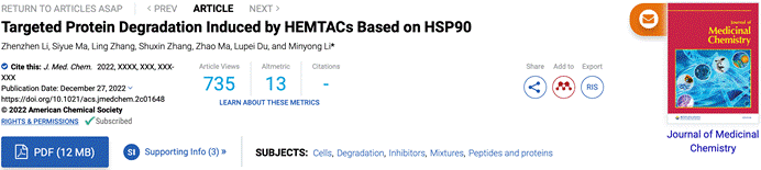 近日,米乐·M6(China)官方网站李敏勇教授团队在新型靶向蛋白降解策略研究领域取得新进展,在药物化学权威期刊Journal of Medicinal Chemistry(中科院一区,TOP)上发表了题为“Targeted Protein Degradation Induced by HEMTACs Based on HSP90”的研究性论文,米乐·M6(China)官方网站博士研究生李臻臻为第一作者,米乐·M6(China)官方网站李敏勇教授为独立通讯作者,山东大学为第一作者单位和唯一通讯作者单位。