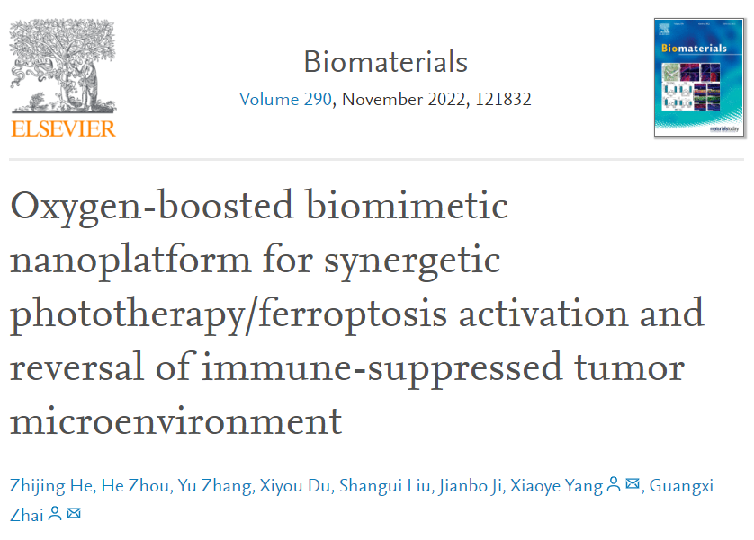 近日,米乐·M6(China)官方网站翟光喜教授、杨小叶副研究员团队在国际期刊Biomaterials杂志上发表了题为“Oxygen-boosted biomimetic nanoplatform for synergetic phototherapy/ferroptosis activation and reversal of immune-suppressed tumor microenvironment”的研究性论文(中科院一区TOP),翟光喜教授与杨小叶副研究员为共通讯作者,博士研究生赫志静为第一作者,山东大学为独立通讯作者单位。