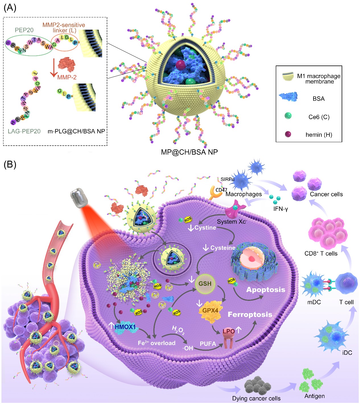 光动力疗法(PDT)通过产生细胞毒性活性氧诱导癌细胞凋亡,但其治疗效果受到癌细胞固有诱导性凋亡抵抗机制和肿瘤微环境(TME)缺氧的阻碍;此外,PDT诱导的抗肿瘤免疫激活不足。为了克服这些障碍,山东大学翟光喜教授与杨小叶副研究员团队制备了一种新型仿生纳米制剂MP@CH/BSA(巨噬细胞膜包覆的白蛋白纳米粒),用于精确递送光敏剂二氢卟吩e6(Ce6)、氯化血红素(Hemin)和PEP20(CD47抑制肽),整合氧增强PDT、铁死亡激活和CD47-SIRPα阻断的协同抗肿瘤作用。Hemin的过氧化氢酶模拟活性可减轻TME缺氧并增强PDT作用,通过经典(下调谷胱甘肽过氧化物酶4途径)和非经典(诱导Fe2+超载)的模式激活肿瘤细胞的铁死亡。研究发现,Ce6可通过经典和非经典模式增效hemin的铁死亡激活作用,纳米制剂通过结合PEP20介导的CD47-SIRPα阻断和PDT介导的T细胞激活,增强了抗肿瘤免疫作用,有效抑制了原发性肿瘤的生长和转移。此外,研究首次发现PEP20可以通过下调system Xc-的表达增敏肿瘤铁死亡的作用。综上,该研究设计了一种简单而有效的策略以提高纳米药物的肿瘤递送效率,为研究肿瘤PDT-铁死亡激活相互作用的机制以及免疫治疗和铁死亡激活之间的联系提供了新的思路,为新型肿瘤联合治疗模式提供了参考。