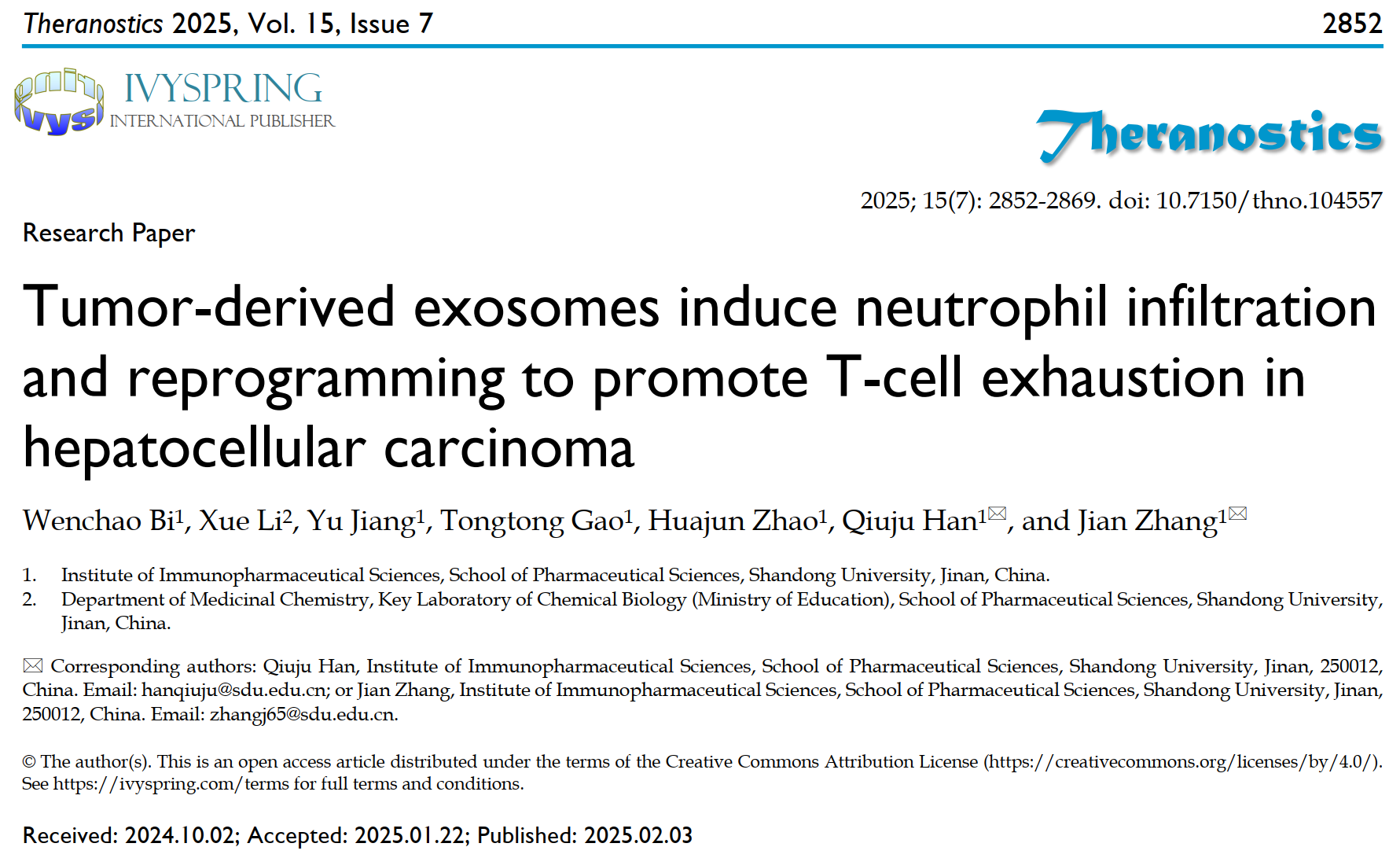 Bi W, Li X, Jiang Y, Gao T, Zhao H, Han Q, Zhang J. Tumor-derived exosomes induce neutrophil infiltration and reprogramming to promote T-cell exhaustion in hepatocellular carcinoma. Theranostics 2025; 15(7):2852-2869. doi:10.7150/thno.104557.