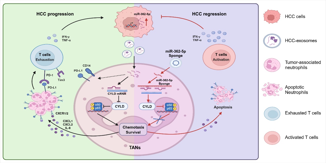本研究中,作者通过TCGA数据库观察到HCC患者样本TANs的高度浸润现象,并在DEN/CCl4诱导的HCC小鼠模型中发现了类似趋势。研究人员深入探究了HCC外泌体对中性粒细胞表型和功能的影响、以及HCC外泌体重编程的中性粒细胞对T细胞耗竭的影响。研究结果显示,HCC外泌体能够显著促进中性粒细胞在肝脏组织的浸润并表现为免疫抑制表型,进而加剧T细胞耗竭和肿瘤进展。进一步研究发现,HCC外泌体促进中性粒细胞的存活和趋化能力,诱导中性粒细胞向促炎、促肿瘤表型极化,抑制T细胞免疫应答。分子机制研究证明,HCC外泌体通过提高中性粒细胞中miR-362-5p的水平下调CYLD的表达,进而激活NF-κB信号通路,增强中性粒细胞的存活和趋化能力。最后,通过构建miR-362-5p Sponge阻断这一信号通路,可以显著抑制中性粒细胞的浸润,同时逆转了T细胞的耗竭状态,并有效抑制了HCC的进展。