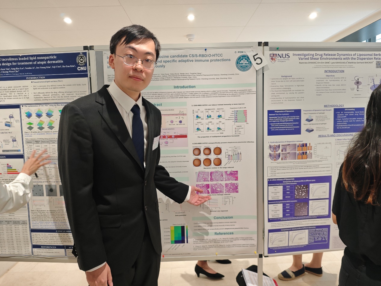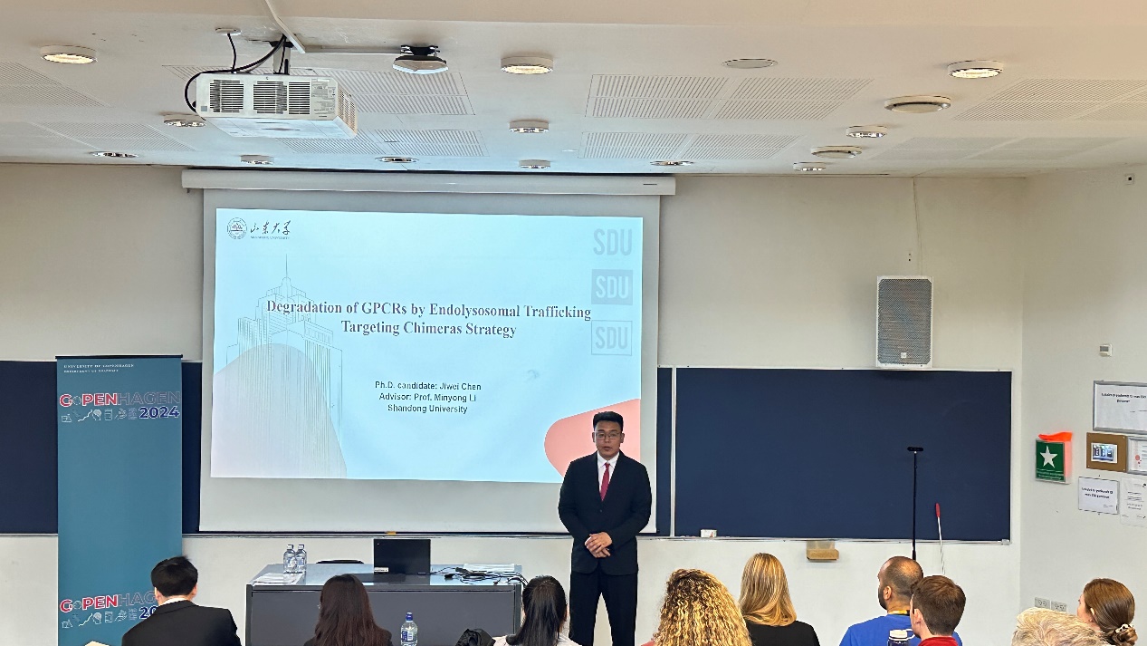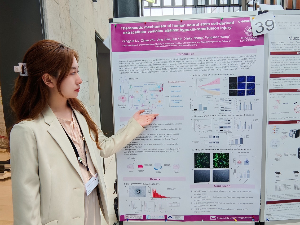 陈继伟作题为“Degradation of GPCRs by Endolysosomal Trafficking Targeting Chimeras Strategy”的交流报告。刘清月和陈逸攀分别作题为“Therapeutic Mechanism of Human Neural Stem Cell-derived Extracellular Vesicles against Hypoxia-reperfusion Injury”和“Intranasal Protein Subunit Vaccine Candidate CS/S- RBD/O-HTCC Induce Nonspecific Innate and Specific Adaptive Immune Protections in Mouse Model Simultaneously”的海报展示。三位博士生的报告与海报赢得了来自世界各地学者的热切关注与高度评价,进一步提高了学校和学院在国际药学研究领域的知名度与影响力。