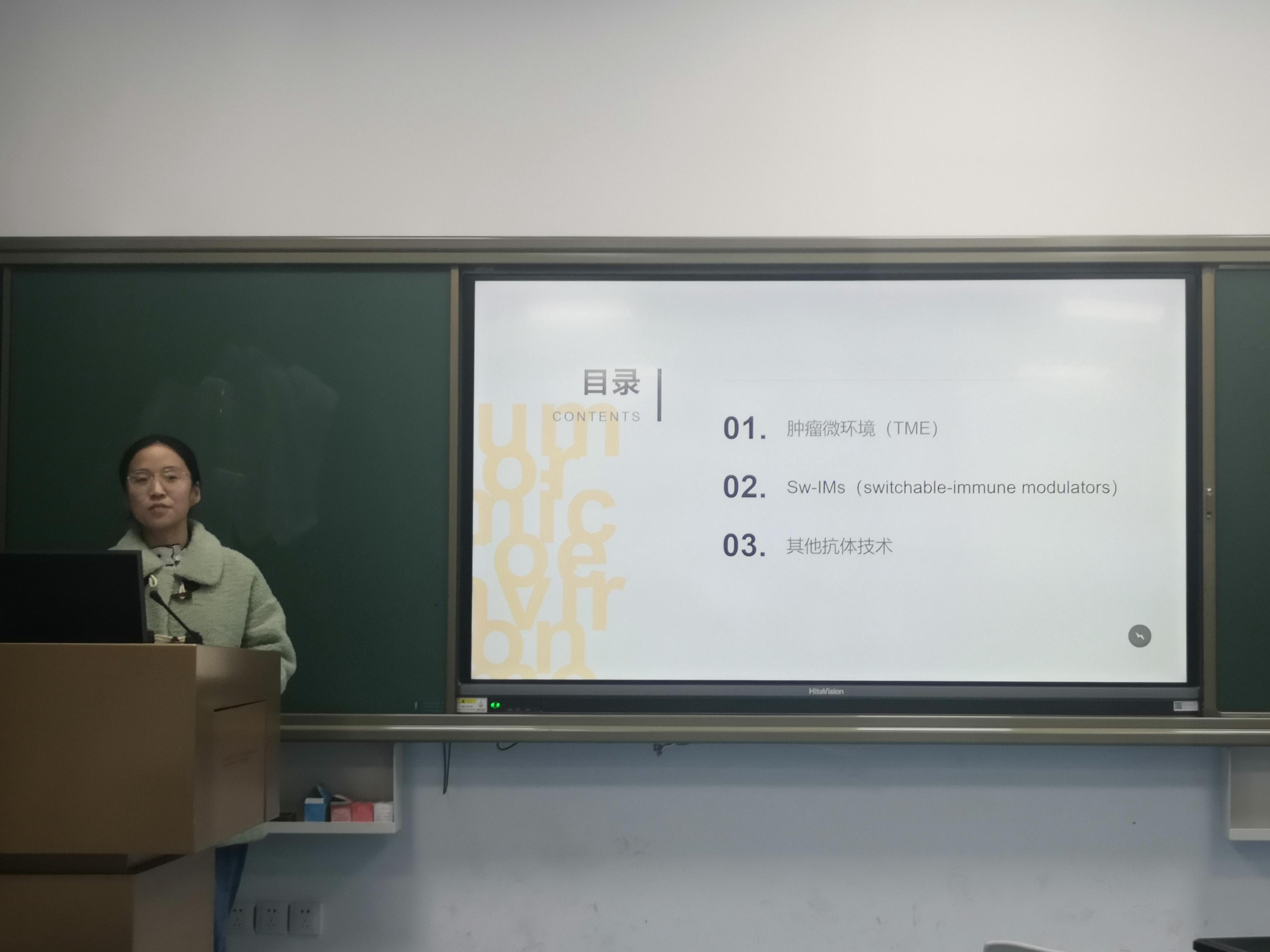 最后,姜又琦为同学们介绍了基于肿瘤微环境的肿瘤治疗方法。她阐述了利用肿瘤微环境的典型特征设计不同免疫疗法的方法,并详细举例介绍了技术特点。如Sw-IMs是利用微环境酸性和还原性的特征,给抗体分子包裹“糖衣”,从而使抗体在肿瘤中发挥作用、减少系统性免疫副作用的生物技术。