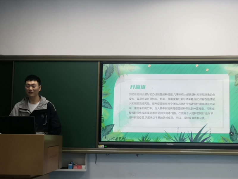 随后,宋璐宁介绍了新型冠状肺炎疫苗的相关知识,他不仅详尽地介绍了传统疫苗和新型疫苗的区别,还阐述了我国研究新冠疫苗的五种技术路线:灭活疫苗、腺病毒载体疫苗、减毒流感病毒载体疫苗、重组蛋白疫苗、核酸疫苗(包括RNA疫苗和DNA疫苗)。通过他生动的讲述,同学们深刻感受到了国家战略布局的前瞻性,体会到了来自祖国的强大支撑力。