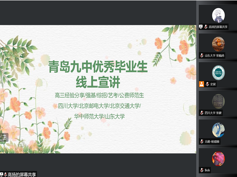 为做好母校回访工作,山东大学“思随母校,闪药未来”母校回访社会实践队在征得高中同意后,先后联系到了华中师范大学、北京交通大学、四川大学以及北京邮电大学的青岛九中毕业生组成青岛九中优秀毕业生线上宣讲团进行联合宣讲。