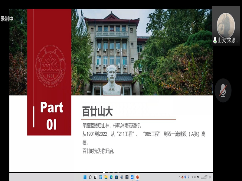 由于天津市疫情较为严重,此次宣讲以腾讯会议的形式于线上开展,本次活动以“筑梦山大,成就未来”为主题,开展了由魅力山大学校介绍宣讲会,励志启航学习经验交流会两部分组成的宣讲。