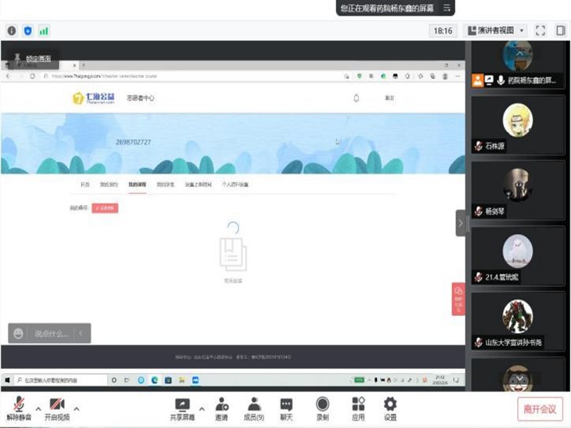 首先,杨东鑫强调了线上支教的相关事项,提醒队员们注意用词要文明,讲话要清晰,着装要得体等等,共同打造高素质讲文明的高校志愿支教队。接着,队员们提出支教服务过程中遇到的问题,进行队内讨论,并一一解决。其中关于七海公益平台网站卡顿的问题,杨东鑫详细讲述了网站的使用注意事项,并投屏示范了线上课程预约的具体操作步骤。