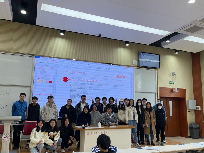 接着,许宁钰根据近几周的团支部工作情况总结了相关事宜,先点出了上学期开展的班级集体活动,包括各种班会以及团日活动,肯定了同学们的思想觉悟,然后展示出同学们填写的上学期参加的志愿活动,并根据大家的志愿活动情况对假期社会实践白皮书的相关事项进行总结,最后鼓励大家多为班集体作出贡献,也为接下来的团支部升级答辩准备材料。