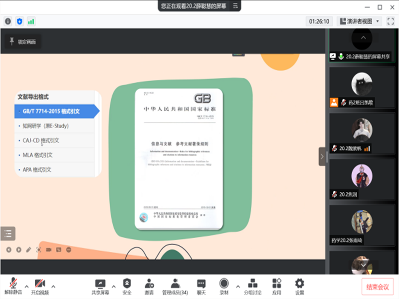 最后,薛聪慧同学讲解了文章引用格式的相关规则,其中,重点介绍了电子文献的著录格式。在分享的尾声中,薛聪慧强调认真准备、及时总结的重要性。薛同学具有较强的专业性和实用性的分享内容,让同学们纷纷表示干货满满。