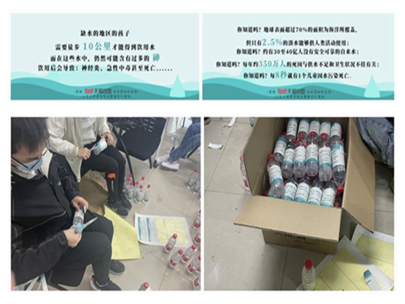 4月5日下午,“水在身边”志愿服务队的成员在中心校区17号楼123室对拟定发放的瓶装水进行包装,更换过包装的瓶装水印有关于“水”的科普知识。同学们在喝水之余,能对缺水地区、水污染地区有所了解,从而更好地树立起珍惜水资源的观念。