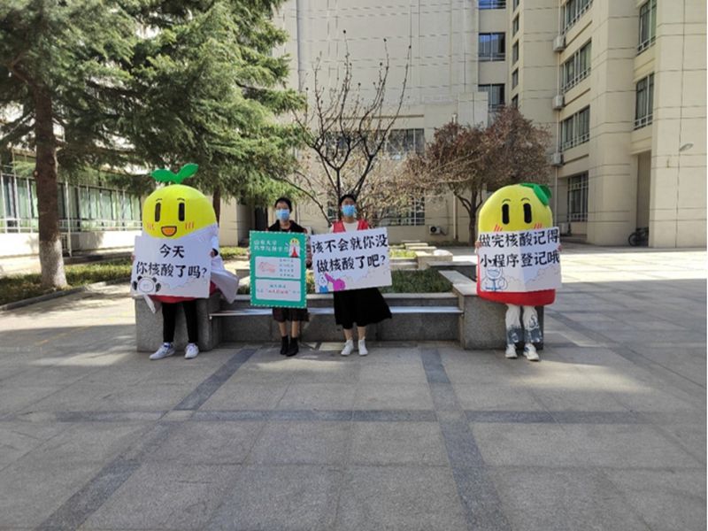 此次志愿服务前期,同学们在闻一多雕塑、理综楼、和平击剑馆、北门天桥下四个地点举牌提醒学生进行核酸检测,同时还有身穿药宝服装的同学在药宝看护员的带领下行走于校园各处,提醒学生进行核酸检测。在志愿服务中期,1班班委增设蒋震图书馆、邵逸夫科技馆、中心图书馆、知新楼核酸点、电教北楼前五个核酸举牌地点,并联合2021级其余班级、护理与康复学院和公共卫生学院共同开展活动。此次活动不仅促进了班级之间以及学院之间的友谊,还在很大程度上坚定了同学们的抗疫决心,有助于疫情防控的深入开展。
