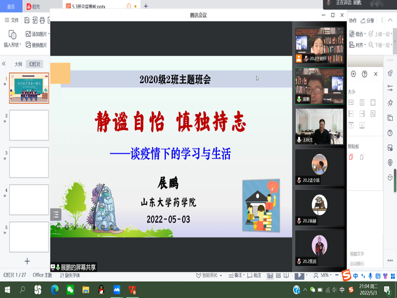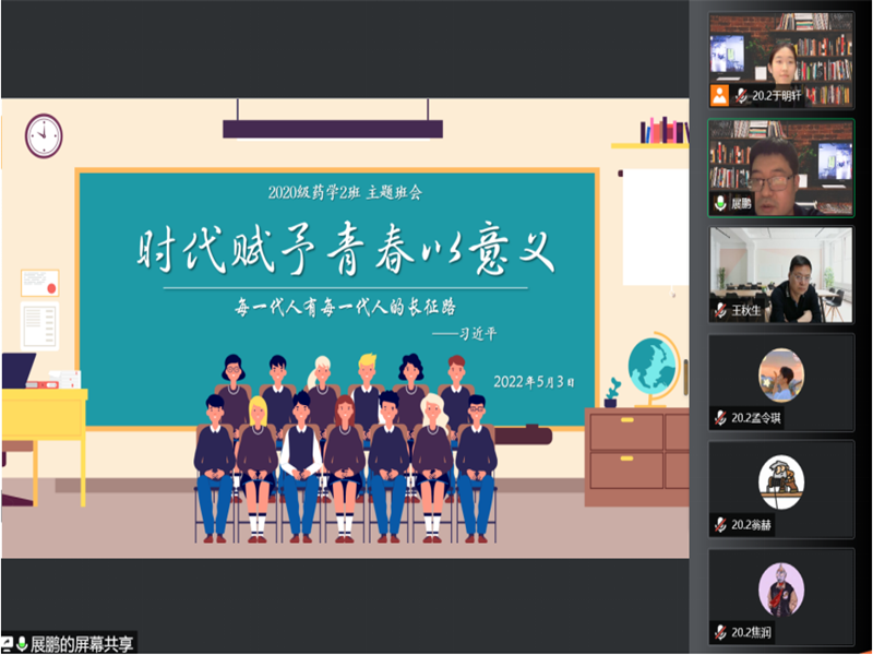 在五四青年节来临之际,为增强同学们的青年使命感,加强师生交流,5月3日晚上21时,米乐·M6(China)官方网站2020级药学2班开展“时代赋予青春以意义”线上主题班会。米乐·M6(China)官方网站党委书记王秋生和班主任展鹏出席会议,班长于明轩主持会议,全班同学参加。