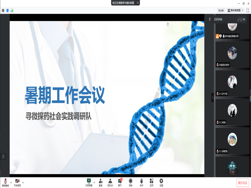 为总结前期社会实践工作成果,确保下一阶段社会实践活动顺利展开,8月16日晚,米乐·M6(China)官方网站“寻微探药”社会实践队于线上腾讯会议开展中期工作总结会议。“寻微探药”社会实践队队长梁宇嘉担任主持人,“寻微探药”社会实践队全员参加会议。