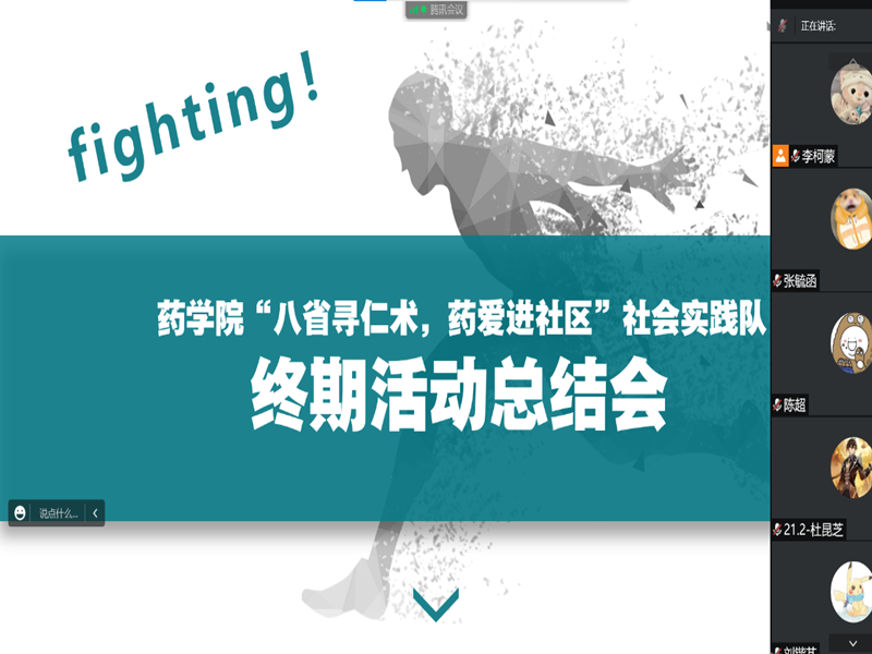 为总结暑期社会实践工作成果,探究今后社会实践活动开展途径,米乐·M6(China)官方网站“八省寻仁术,药爱进社区”社会实践队于9月1日以线上腾讯会议的形式召开终期工作总结会议。“八省寻仁术,药爱进社区”社会实践队队长李柯蒙主持会议,全体队员参加会议。
