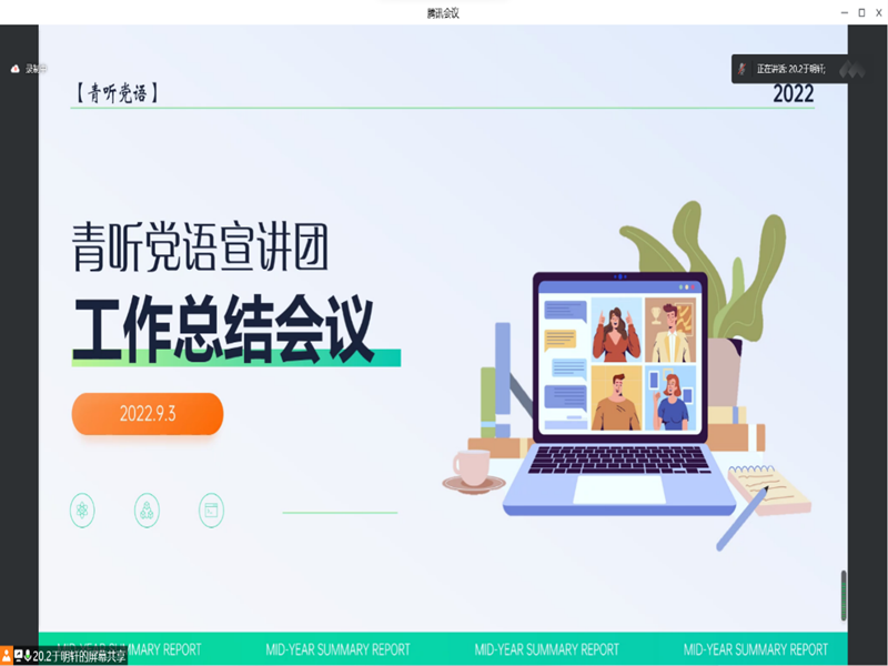 历时两个月,山东大学“青听党语”宣讲团开展的喜迎党的二十大“牢记青春寄语”主题宣讲于暑期的最后进入了尾声。在这两个月的时间里,宣讲团全体成员认真学习贯彻习近平新时代中国特色社会主义思想,以迎接党的二十大为主线,展开了一系列主题宣讲。9月3日,米乐·M6(China)官方网站“青听党语”宣讲团于线上召开终期工作总结会议。队长于明轩主持会议,“青听党语”宣讲团全体队员参加会议。