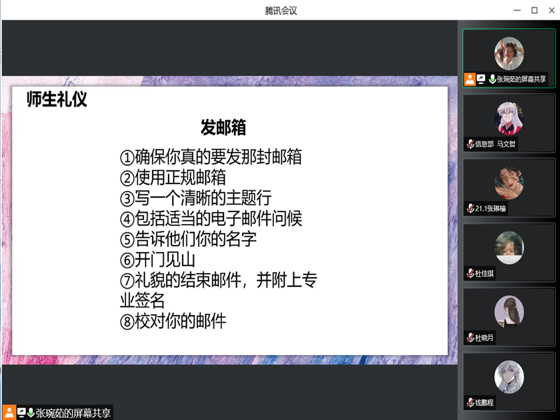 在师生礼仪部分,张琬茹提出礼貌周到、姿势端正、态度尊重三方面要求,并通过具体案例指出与老师相处的正确方式。其次,她强调了向老师发送邮件时应注意的事项:要格式正确、主题明确、简明扼要、准确无误。