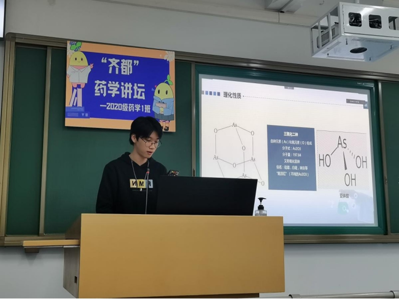 之后,林逸超以视频作为导入,从三氧化二砷(即砒霜)的理化性质、毒性危害、成药之路和启示感悟四个方面向同学们进行介绍,仔细讲解了砒霜抗白血病的作用机制,以药学人的角度宣传了中西医结合的理念。