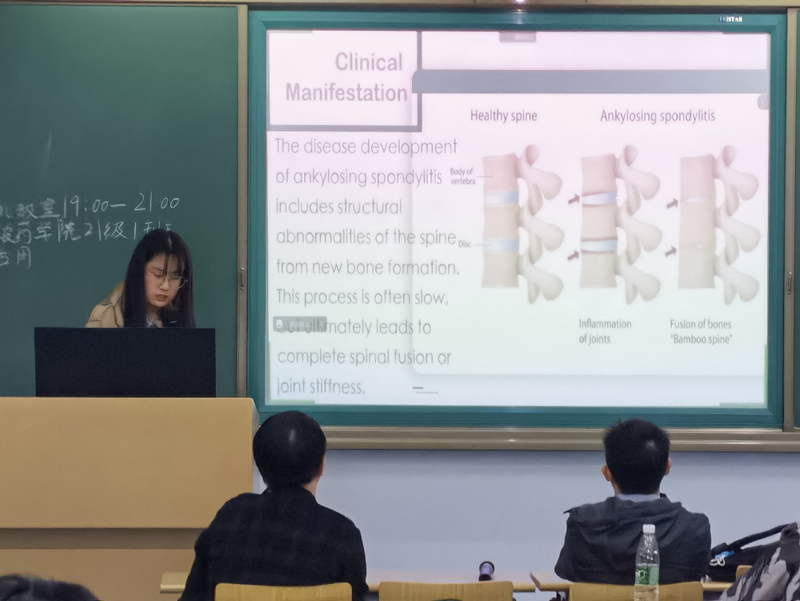 首先,党雨萌以全英文展开展示,全方位地对强直性脊柱炎及其治疗药物展开介绍,使得同学们对该疾病及其治疗发展有一定的了解。