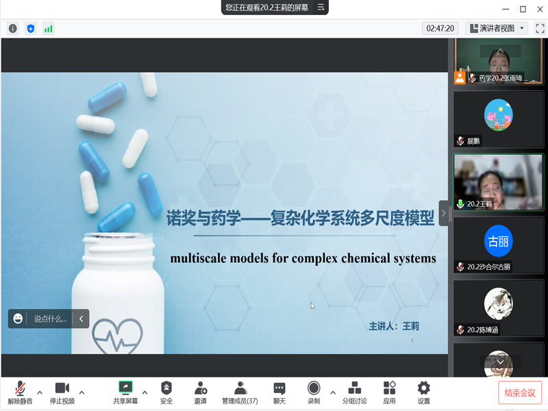 接着王莉也从诺奖入手,介绍了多尺度化学,给同学们带来了一种用于测定分子结构及之间相互作用的技术,并介绍了这种技术在药学中的应用,对这种技术进行了展望,全面介绍了一种技术的发展应用历程。