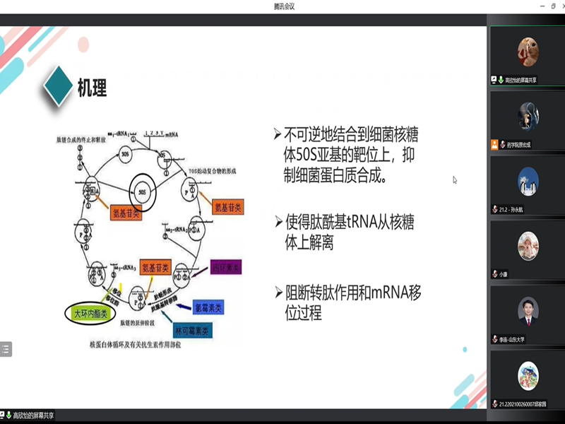 之后,高欣怡结合自己对红霉素这一药物的认识过程,向同学们讲解了其机理、应用与发展等,这让同学们对红霉素建立了更科学的认识。最后,王爽向同学们讲解了HIV的发展历程、致病机理、临床症状以及预防措施等,并向同学们分享了相关的前沿知识。