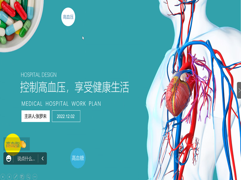 第一位演讲同学是张罗未。他演讲的题目是《控制高血压,享受健康生活》。他从什么是高血压、高血压的形成机理、高血压的起因和危害、常见降压药、预防高血压的方法以及患高血压的特殊人群的注意事项等方面对高血压进行了较全面的讲解与科普。