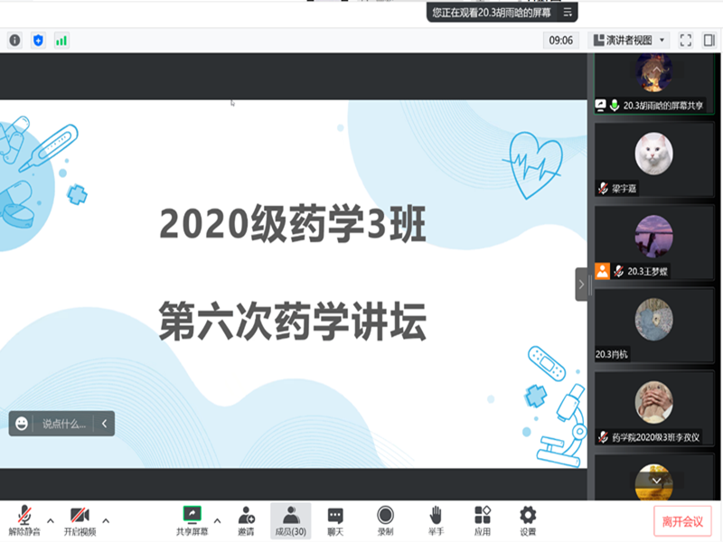 为提高学生的科研能力,11月25日下午14时30分,米乐·M6(China)官方网站2020级3班于线上开展第六期药学讲坛活动。本次活动由衣珍妮、徐嘉欣、杨林和、吴光荣、李孜仪五位同学主讲,胡雨晗担任主持,班主任徐泽军出席。