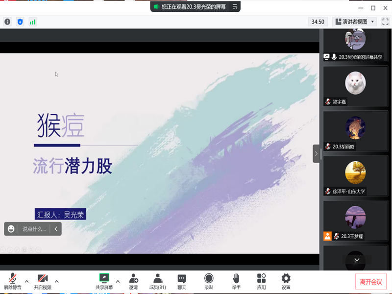 第四位演讲的吴光荣以《猴痘,流行潜力股》为题,介绍了这一突发性重大疫情疾病,同时从“还原进化”的角度带大家了解了猴痘病毒的变异方式,警示了“小病毒突变大杀手”的可能,提醒大家关注疫情,重视疫情。