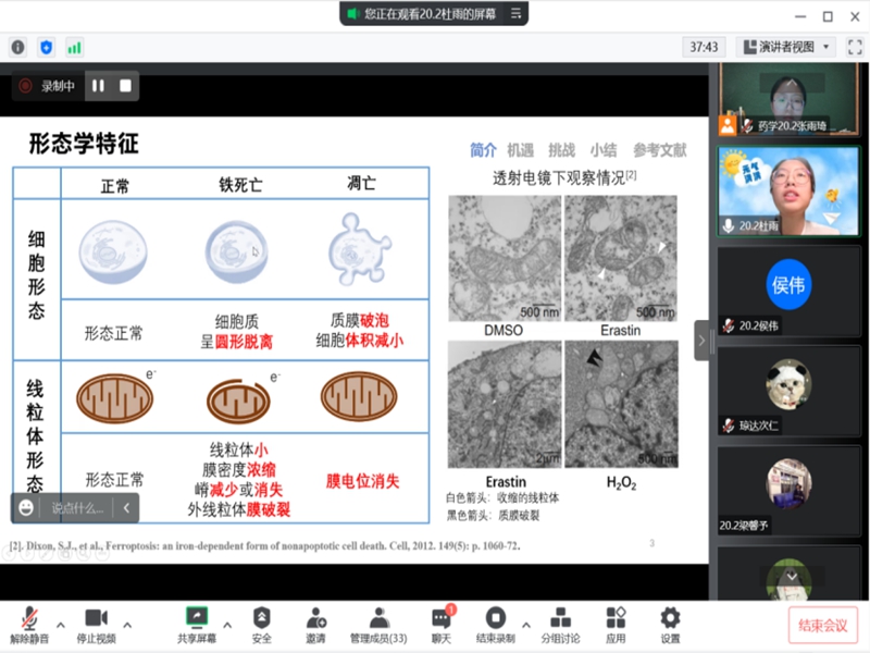首先,杜雨给我们带来关于铁死亡的知识,具体介绍了铁死亡的相关机制、展示了其靶向抗癌的应用,最后用思维导图总结所展示的内容,由浅入深,让同学们受益匪浅。胡嘉育从银自古以来的用途切入,结合诺贝尔奖获得者的科研,给同学们带来了关于抗菌材料纳米银的知识,从四个方面介绍其抗菌机理以及其作为抗生素的优点,最后提出了抗生素滥用的问题,发人深省。