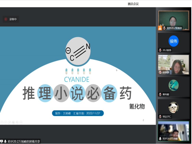 11月27日晚19时,2020级药学2班于腾讯会议举办了第五期药学讲坛活动。本次活动由杜雨、胡嘉育、琼达次仁、万旭峰、于明轩和陈博涵六位同学担任主讲人,并邀请到了博士生姜向毅、徐淑静作为评委参与此次活动。