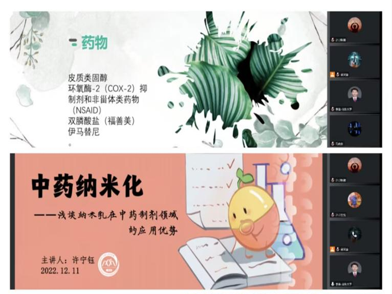 接着,许宁钰就纳米乳在中药制剂领域的应用优势进行了中药纳米化方面的知识分享。许宁钰从中药使用周期长、见效慢这两个特点引出使用纳米化创新性提高中药生产技术的必要性。而后,她从提高中药有效成分的口服生物利用度、增强中药有效成分的靶向作用、延缓中药有效成分的释放三方面依次展开,帮助同学们深入了解了纳米乳的优势。