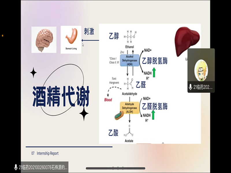 接着,石株源同学以《头孢配酒,唢呐一宿》为题,以情景带入的形式,向同学们介绍了酒精和头孢在体内的代谢过程,重点讲解了酒精在头孢作用下对人体的危害,同时拓展了部分与之类似的药酒同吃的服药禁忌,向同学们树立起吃药后应避免饮酒的警戒理念。