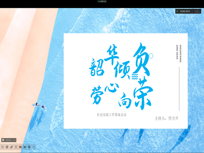 1月3日下午四时,米乐·M6(China)官方网站“韶华倾负,劳心向荣”社会实践队于线上召开工作筹备会议。本次会议旨在明确社会实践的目标和工作流程、分配工作任务及探讨社会实践相关问题。米乐·M6(China)官方网站“韶华倾负,劳心向荣”社会实践队队长符方开主持本次会议,社会实践队全体成员均按时参会。