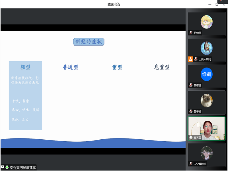 首先,秦秀雯围绕新冠的症状展开宣讲。新冠的症状分为轻型、普通型、重型以及危重型。轻型的临床症状轻微,影像学未见肺炎表现,患者主要表现为轻度干咳、鼻塞、恶心、呕吐、腹泻、低烧、乏力等;普通型的临床症状明显,影像学可见肺炎表现,患者会出现鼻塞、流涕、咽痛、恶心、呕吐等症状,与轻型的症状类似,但更为严重;对于重型患者,多在发病一周后出现呼吸困难,可能伴随低氧血症;最后是危重型患者,他们会出现呼吸衰竭,需要机械通气,还会伴有其他合并其他器官功能衰竭,例如难以纠正的代谢性酸中毒、急性心肌损伤和出凝血功能障碍等,严重者甚至会出现休克状态,需要转入ICU进行治疗。