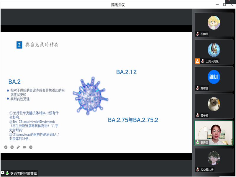 接下来,秦秀雯就有关奥密克戎种类方面知识展开了分享。她从奥密克戎变异的时间轴讲起。BA.1为奥密克戎原始毒株,到2021年12月,开始出现许多以前未知的突变体。到2022年6月,BA.1出现高达50个突变体,其中32个突变与刺突蛋白有关。到2022年12月,该病毒在其他基因组区域带有一些变化和缺失,例如在弗林蛋白酶裂解位点有三个突变,这有利于其传播。最后,秦秀雯介绍了奥密克戎的种类如BA.2、BA2.12等多种变异体等,并对它们的特点进行了详细的介绍。至此,本次分享会告一段落。