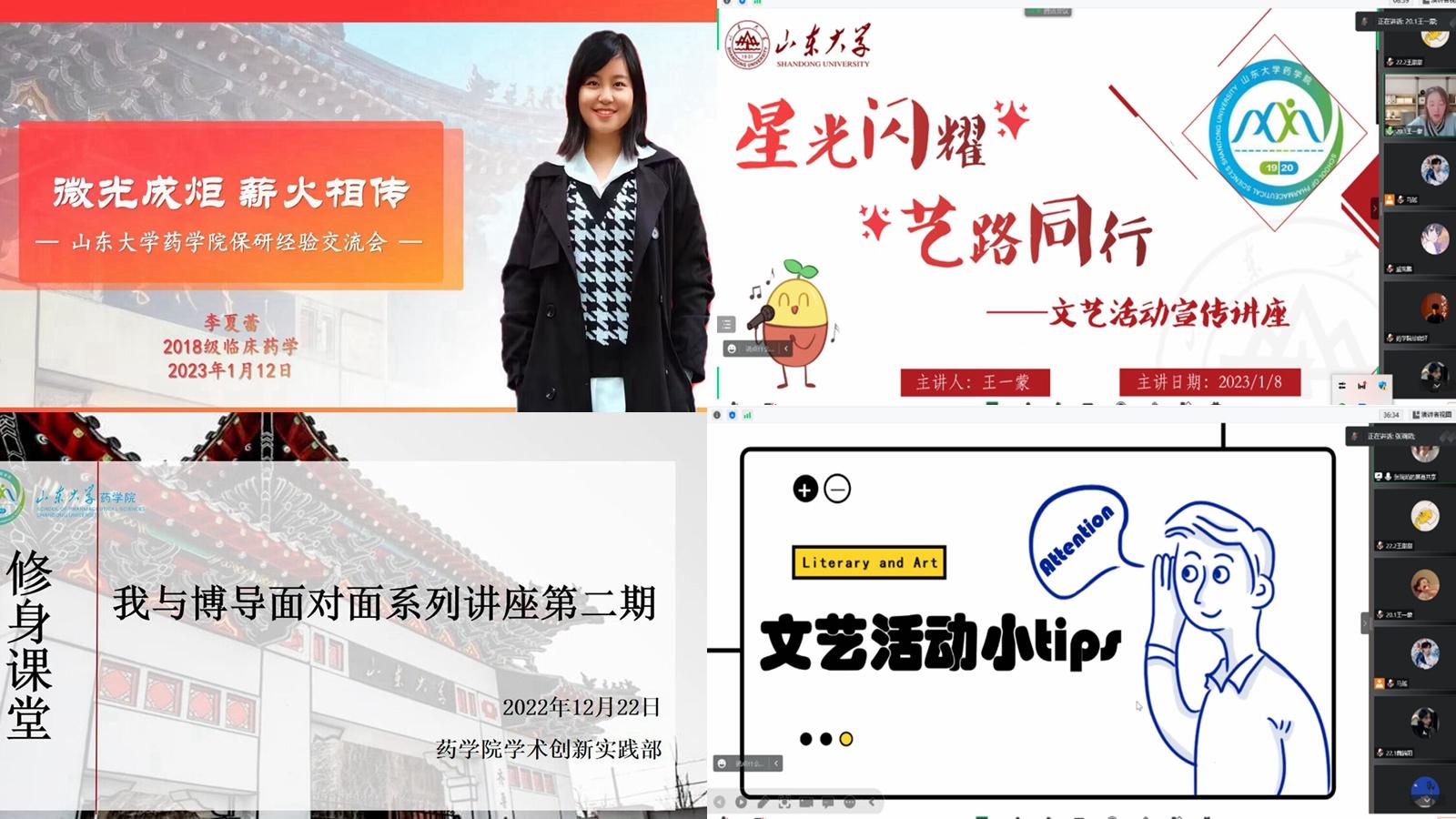 汲取经验,规划未来,线上讲座受益匪浅。为帮助同学们更全面地了解药学前沿发展方向,提高对专业的学习兴趣,学院举办了我与博导面对面和考研保研讲座,邀请到多位博导大咖以及优秀学长学姐为同学们分享经验,帮助同学们更好地规划未来学习生活。